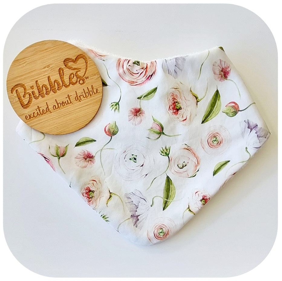 Bibbles Dribble Bibs are made with 100% cotton and backed with absorbent cotton toweling to keep the neck and clothes dry from dribble. Each bib has 2 snaps to fasten to your desired fit.